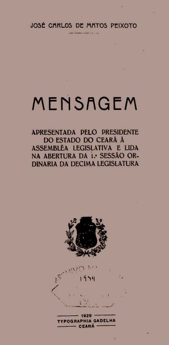 [7] Ver “Mensagem apresentada pelo Presidente do Estado do Ceará a Assembleia Legislativa e lida na abertura da 1ª seção ordinária da decima legislatura”, 1929, Ed. Tipografia Gadelha, Ceará, págs. 12 a 15.