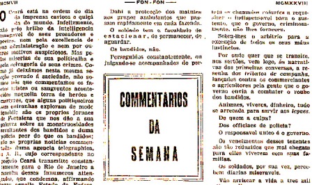 Na edição de 5 de maio de 1928 da Fon-Fon, encontramos o subtítulo “O Penhomeno do Banditismo”, igualmente publicado na seção “Commentarios da Semana”, onde o autor afirma que o cangaceiro do Nordeste seria um herói abortado. Para o articulista este cangaceiro do sertão, possuidor de enorme energia natural, sem direcionamento, se perde na pobreza e no atraso que vivia a região.