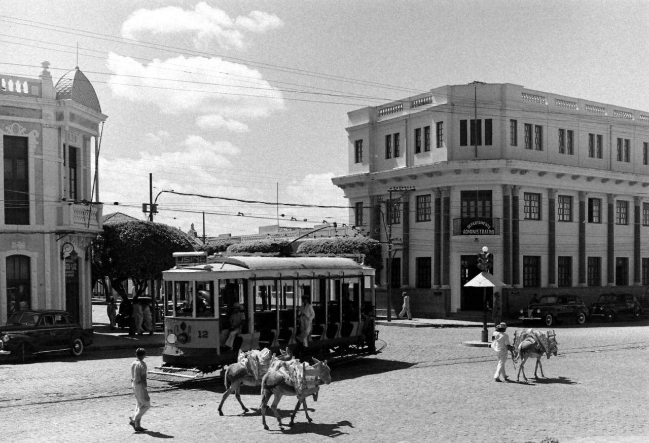 Foto da revista Life, realizada em fins de 1941, ou no início de 1942, mostrando um típico bonde de Natal noscruzamento das Avenidas Duque de caxias e Tavares de Lyra, no bairro da Ribeira.