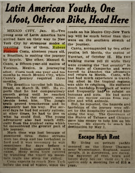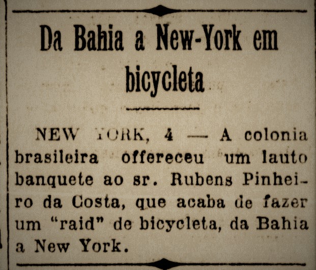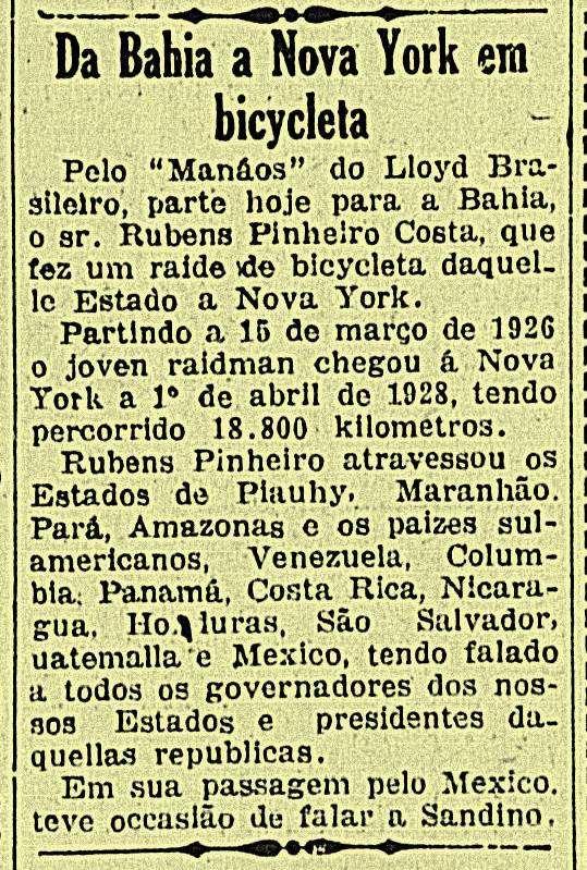 Às 14 h do dia 1.º de abril de 1929, depois de passar dois anos pedalando, o ciclista Rubens Pinheiro chegou a Nova York. Ele não tinha mais a foto da namorada, que perdera no início da viagem, ainda na Bahia, desesperando-se, mas colecionou novos amores durante a viagem.