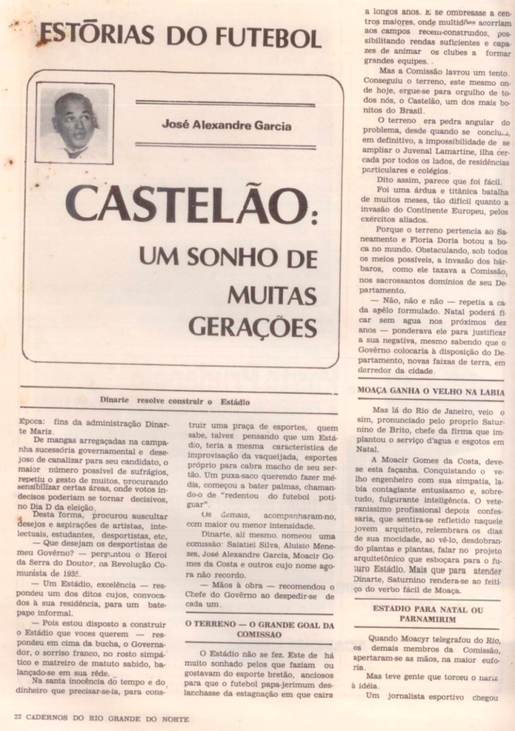 [3] “(…) Entretanto, no exato momento que se lançou a ideia de construir um estádio, lá estávamos na linha de frente, integrando a comissão que conseguiu do Governador Dinarte Mariz, a doação do então FND, o terreno de Lagoa Nova, e quando o Prefeito Agnelo Alves chamou a si a incumbência de tornar realidade o estádio, lá estávamos ao lado de Ernani, Moacir e outros desportistas, trabalhando como diretor administrativo”. GARCIA, José Alexandre Odilon. Gol de Placa. Natal: Ed. Clima, 1992, p. 9.