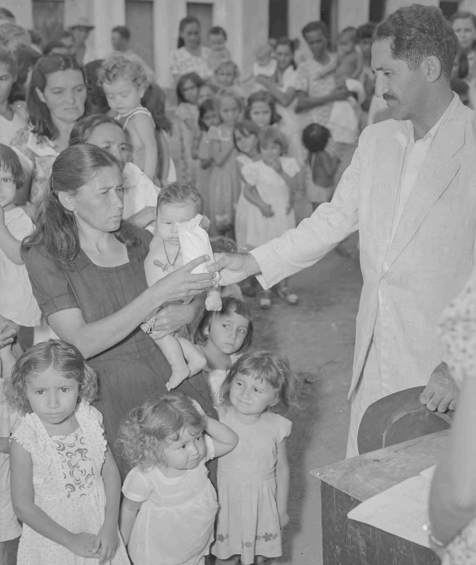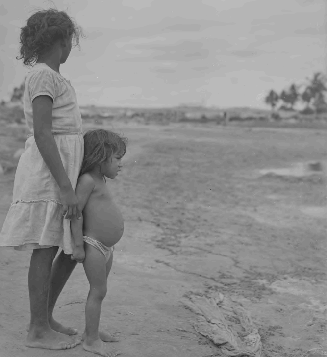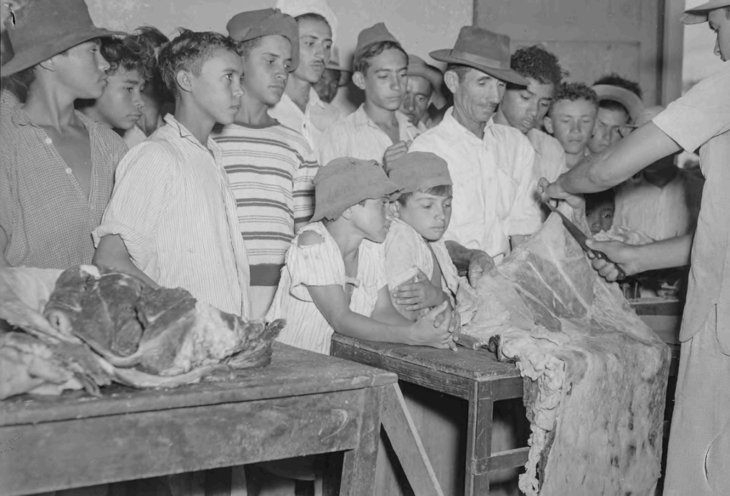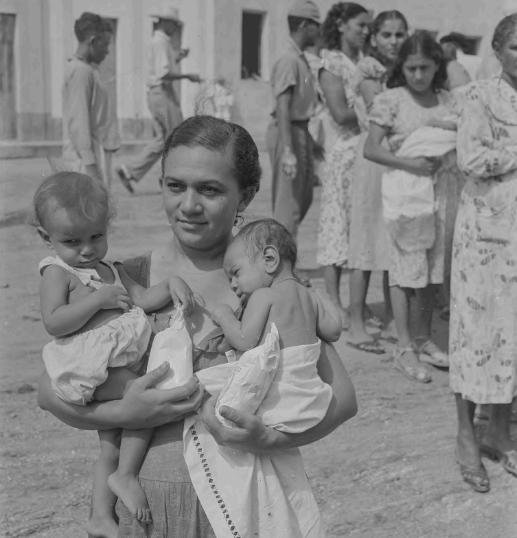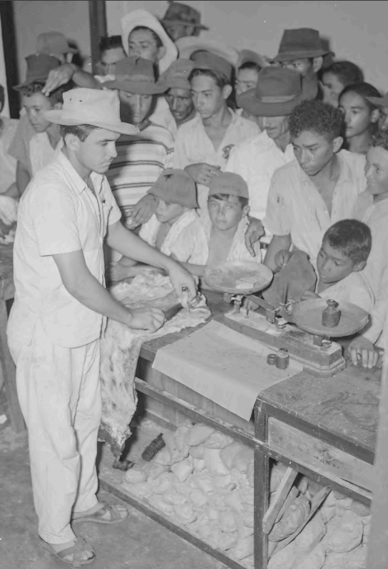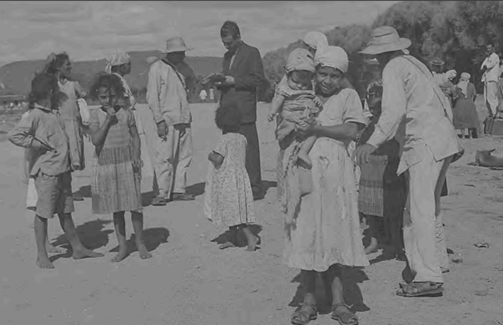 Provavel político de alguma cidade nordestino entregando alimentação para uma mãe cercada de filhos. As secas nordestinas foram, são e continuarão a ser grande material de barganha e propaganda política.