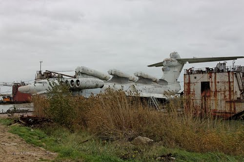 Um dos modelos de ekranoplano se encontra colocado em uma grande rampa, as margens do mar Cáspio, na cidade de Makhachkala, no Daguestão, na Federação Russa.