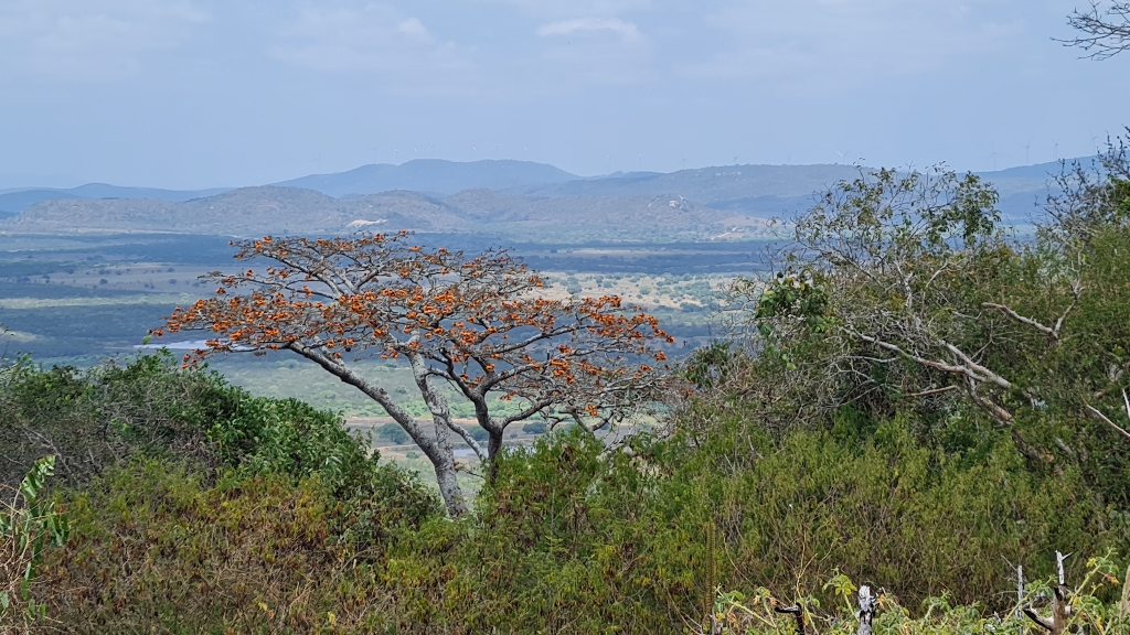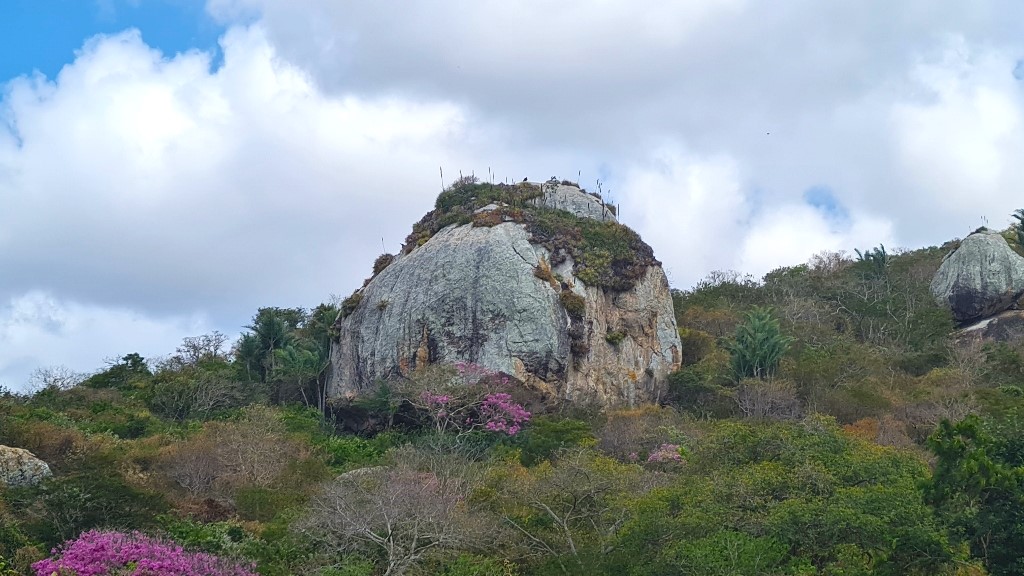 Seguimos o caminho indicado, onde deixamos nosso carro à beira da estrada de terra batida, no inicio da “Ladeira da Coãn” que sobe a Serra de Santana. Com uma altitude máxima de 840 metros, o visual da imponente serra é espetacular.