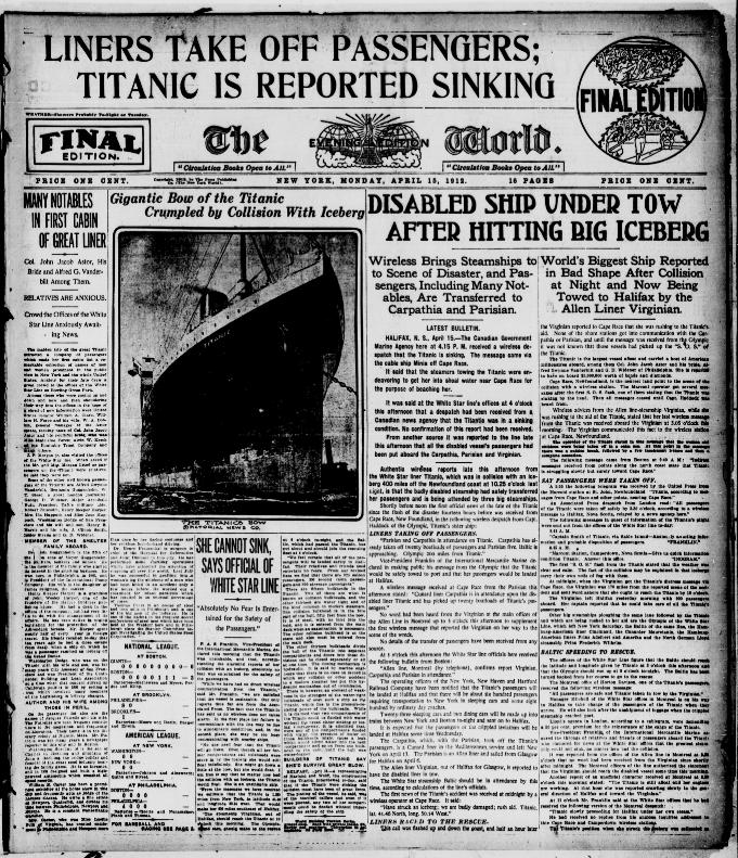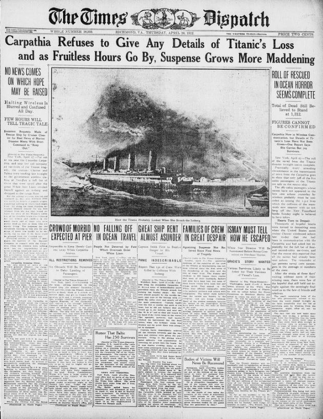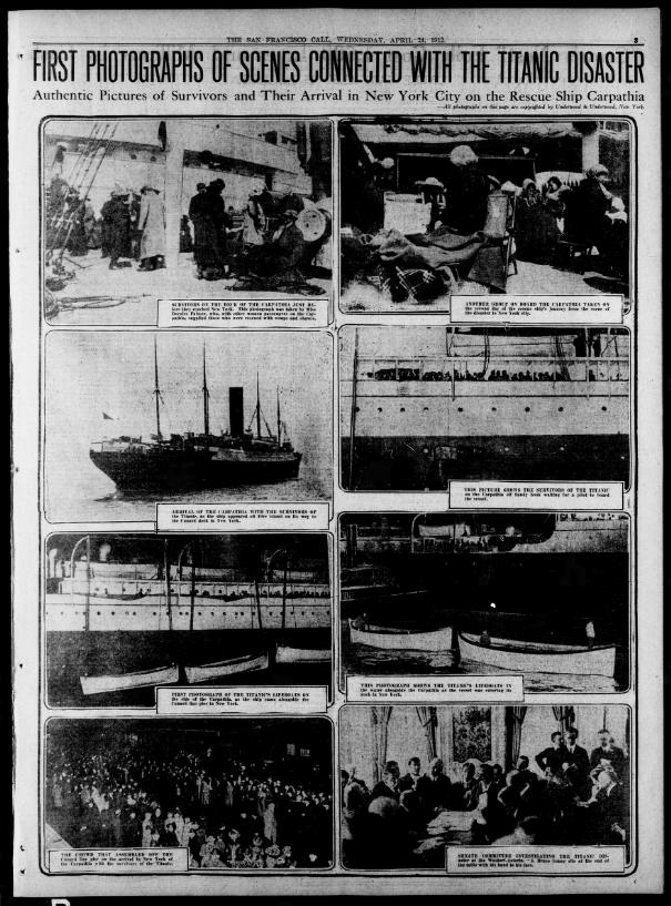 Entre 00:15 e 02:17 horas da manhã, vários navios relatam ter ouvido os sinais d e SOS do Titanic. Estes incluem o navio irmão do Titanic, o transatlântico Olympic, que está a 500 quilômetros de distância. Seis navios, entre eles o Carpathia tentam vir prestar assistência.