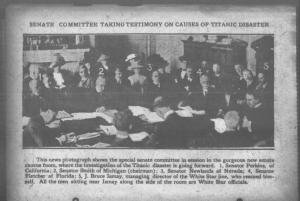 Foto de um jornal da época, mostrando o comitê do senado norte americano, criado para debater as causas do desastre do Titanic