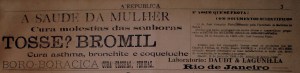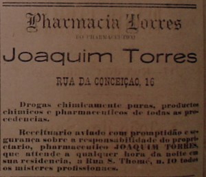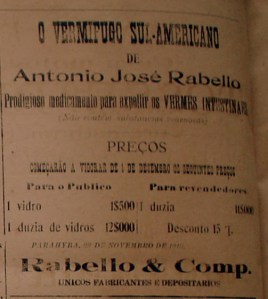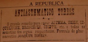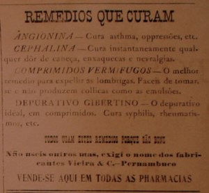 Já as propagandas dos remédios têm para escolher a vontade. Estes anúncios apontam as virtudes dos produtos que curavam as verminoses, as coceiras e principalmente a tuberculose, a AIDS de 1911.  Muitos destes medicamentos vinham de fora, principalmente do Rio de Janeiro e Recife. Mas havia a “prata da casa”, como o “Antiasthmatico Torres”, produzido na botica do Sr. Joaquim Torres (abaixo).