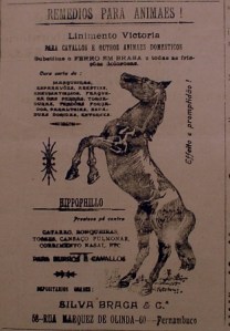 Como comentei anteriormente, um dos principais meios de transporte na época eram as alimárias.  Todos sabem que cavalo, burro e jumento não são iguais as motos CG-125 (Que substituiu a todos no sertão), onde é só colocar gasolina no tanque, dar no pedal e rodar. Tinham de botar comida, marcar e colocar remédios quando o animal ficava doente. Vejam o anúncio abaixo de uma loja de produtos veterinários de Recife, sendo divulgada na Natal de 1911.