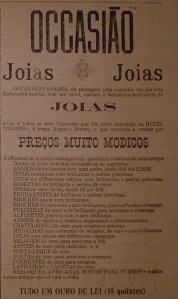 O anúncio abaixo é de um “caixeiro viajante”, que aqui esteve em junho de 1911, vendendo todo tipo de joias, ouro e outras coisas cintilantes. É bem verdade que naquele tempo dava para circular pela cidade com pingentes, correntes e braceletes sem medo de ser roubado.