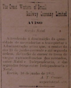 Do transporte ferroviário trago duas informações sobre as principais empresas que atendiam o Rio Grande do Norte, a Estrada de Ferro Central e a The Great Western Railway Company Limited. Naquele junho de 1911, as empresas estavam tratando de situações relativas a desapropriação de terras e o cancelamento de horários de trens pela baixa quantidade de material a ser transportado. Detalhe; o destino ferroviário denominado “Independência” é a atual cidade paraibana de Guarabira.