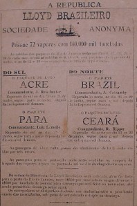 Mas voltando para 1911, quando se tinha a informação que um navio atracaria em nosso complicado porto cheio de pedras na entrada, com destino ao exterior, o representante da mítica empresa “Lloyd Brasileiro” sapecava com antecedência um anúncio nos jornais , para que os exportadores se preparassem para mandar de tudo para os gringos. Veja abaixo um destes anúncios que, pelo menos nesta época, não eram muito comuns.