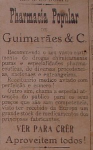 Quando comento que a população da Natal de 1911 tinha inúmeros problemas com a saúde, é porque grande parte das propagandas dos jornais “A Republica” e “Diário do Natal” é sobre medicamentos e farmácias. Dos estabelecimentos que atendiam as mazelas da saúde da nossa gente escolhi duas boticas. Uma que mostra a do competente farmacêutico Joaquim Torres (acima) e outra da Farmácia Popular (abaixo).