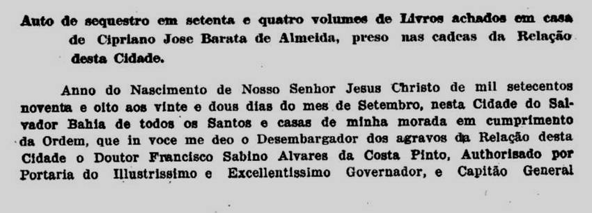 Neste mesmo dia 22 de setembro, por ordem do Desembargador Francisco Sabino da Costa Pinto, foi realizado um “Auto de Sequestro” de 74 livros encontrados na casa de Cipriano pelo capitão Joaquim José de Sousa Portugal.