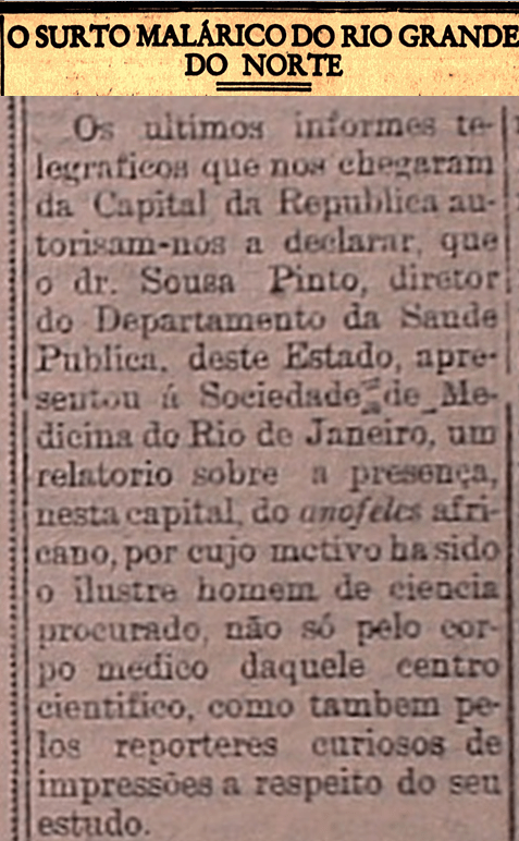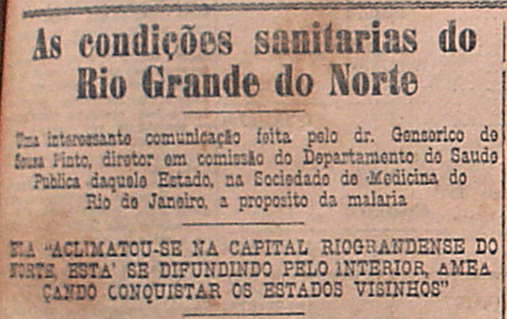 Entre abril e junho de 1930, a cidade de Natal sofreu uma epidemia de malária, a mais intensa e violenta ainda verificada neste hemisfério. Durante a longa estação seca, de junho a fevereiro, a epidemia decresceu, para em seguida rebentar de novo e com redobrada virulência.