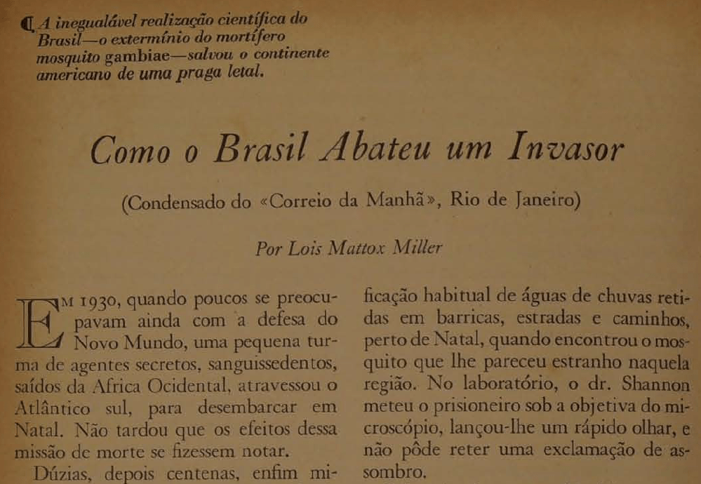 A inigualável realização cientifica do Brasil — o extermínio do mortífero mosquito gambiae — salvou o continente americano de uma praga letal.