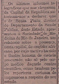 O Dr. Raymond C. Shannon, entomologista da Fundação Rockefeller[3], adido ao Serviço de Combate à Febre Amarela no Brasil, andava perto de Natal procedendo a sua verificação habitual de águas de chuvas retidas em barricas, estradas e caminhos, quando encontrou um mosquito que lhe pareceu estranho naquela região. No laboratório, o Dr. Shannon meteu o prisioneiro sob a objetiva do microscópio, lançou lhe um rápido olhar, e não pôde reter uma exclamação de assombro.