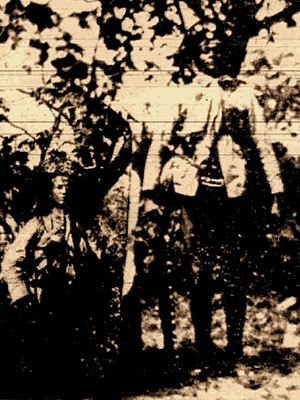 Segundo o relato de Abrahão a jornal Diário de Pernambuco, os dois primeiros cangaceiros que ele encontrou foram Mergulhão (dir.) e Juriti (sentado a esq.). Coleção do autor.