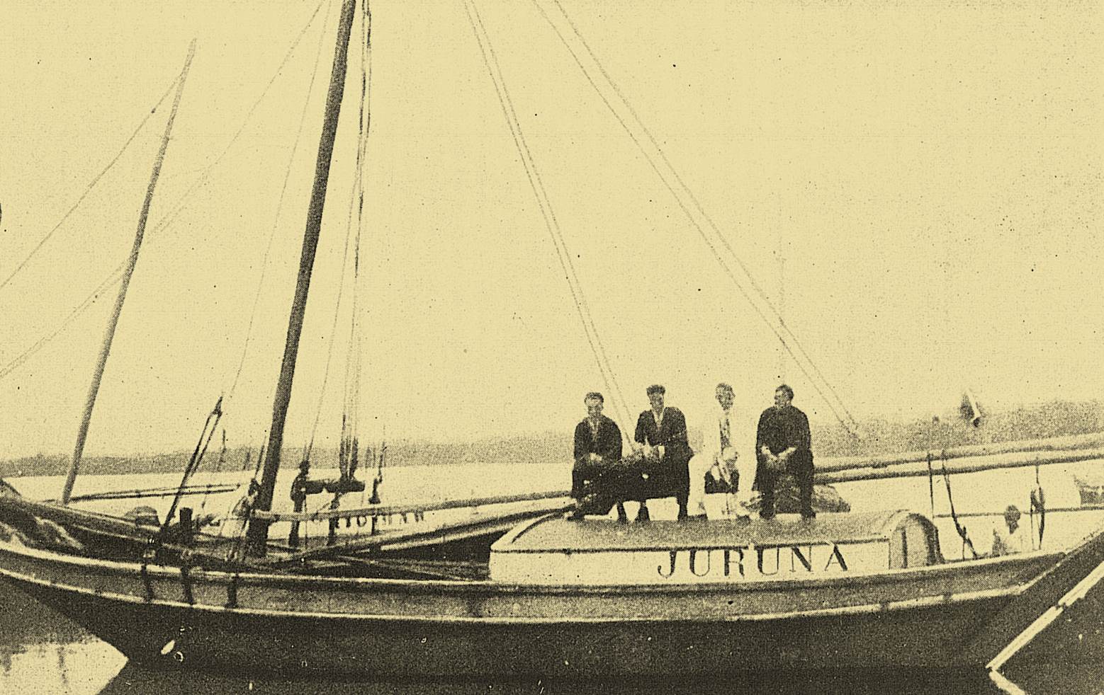 Expedição alemã singrando as águas do Rio Jari, no trecho navegável antes da cachoeira Santo Antônio. Na popa da embarcação pode ser vista uma bandeira com a cruz suástica, simbolo do nazismo.