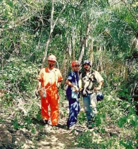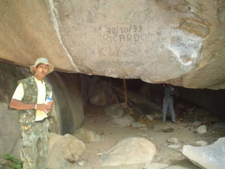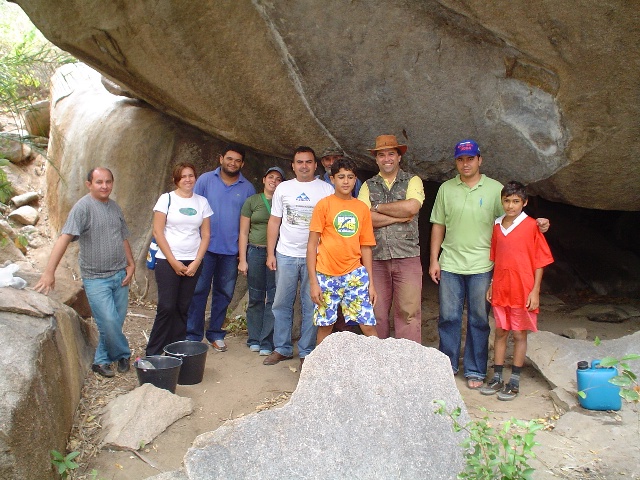 1998-Foto da primeira visita da SEPARN a gruta do cangaceiro Jesuíno Brilhante, em época de chuva. Da esquerda para a direita estão os amigos Adeilton Rigaud Lucas Santos, Joaquim das Virgens Neto e o autor deste artigo. Adeilton e Joaquim atualmente são respectivamente geólogos da Petrobrás e do CPRM