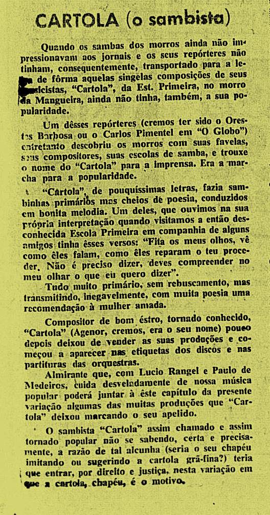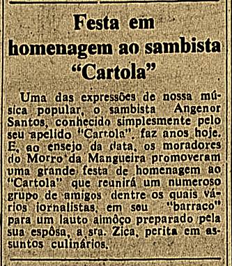 Angenor de Oliveira, ou simplesmente Cartola – apelido que ganhou dos colegas de ofício de servente em virtude de um chapéu-coco que usava para se proteger do cimento que caia – nasceu em 11 de outubro de 1908, no bairro do Catete, no Rio de Janeiro, porém toda a sua infância foi vivida no bairro de Laranjeiras.
