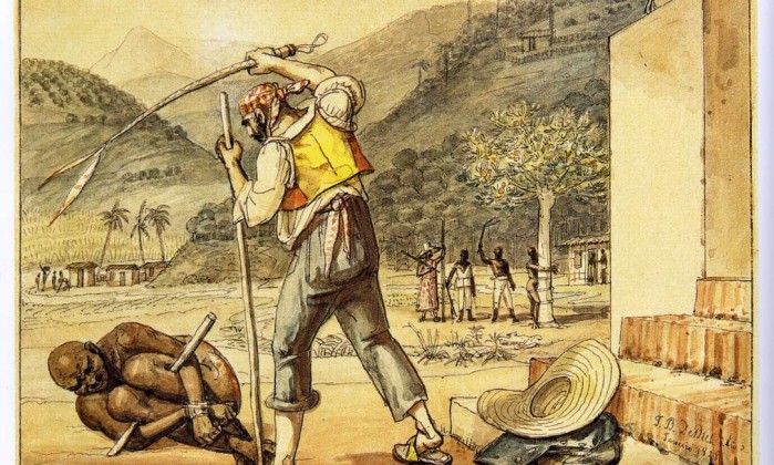 Muitas décadas após a expulsão dos holandeses do Brasil, assim o francês Jean Baptiste Debret viu o castigo a um cativo – Fonte – Wikipedia.com