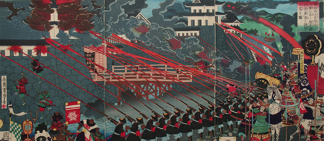 O exército de Nobunaga estabelece cerco a numerosos castelos, por Utagawa Yoshitora 「歌 川 芳 虎」 (1871) – Fonte – http://enterjapan.me/yasuke/