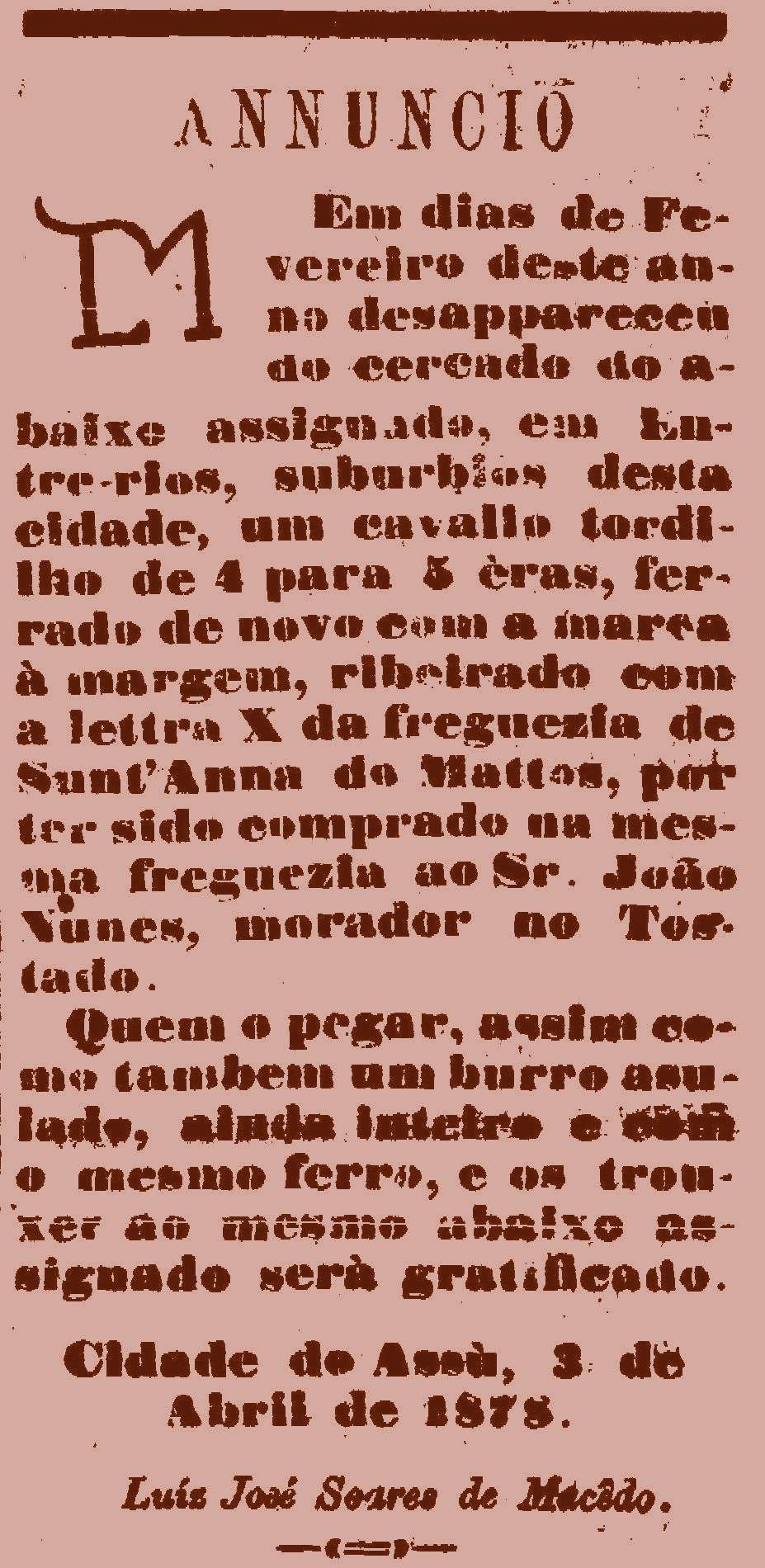 Na notícia que segue, com a indicação do jornal, vemos o desespero do Sr. Luís José Soares de Macedo, de Açu, em busca do seu cavalo que tinha “de 4 para 5 eras”, ou seja seu animal tinha de 4 a 5 anos de vida. No anúncio, em destaque, aparece a marca ferrada do animal, a única forma de provar que o animal pertencia ao Sr. Luís Macedo.