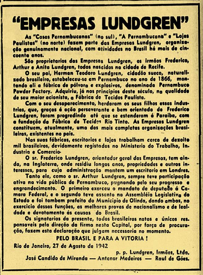 Diante das desconfianças, os Lundgrens publicaram um anúncio na imprensa carioca em 1942, para mostrar a condição de brasileiros e contra as forças do Eixo
