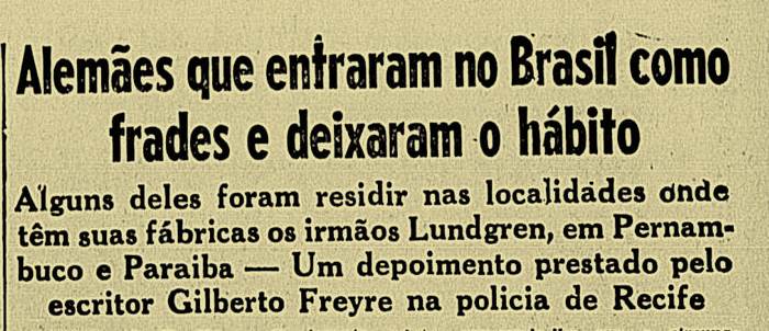[4] O empresário pernambucano Frederico João Lundgren (1879-1946) foi uma espécie de desbravador em seu tempo. Tratado como coronel, gerou 22 filhos, teve várias mulheres e se tornou uma espécie de lenda do comércio ao levar tecidos e outras mercadorias a dezenas de pequenas cidades do interior do país. Herdeiro de uma tecelagem, Lundgren teve, em 1908, a ideia de criar uma cadeia de varejo pela qual pudesse vender seus produtos. Era o começo das conhecidas Casas Pernambucanas. Ver – http://exame.abril.com.br/revista-exame/edicoes/0726/noticias/a-sobrevivente-m0053283 e https://tokdehistoria.com.br/2014/05/12/oxente-hitler-arquivos-e-documentos-mostram-que-os-nazistas-estiveram-na-paraiba/