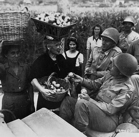 Soldados norte-americanos da 34º Divisão de Infantaria, conhecida como “Divisão Red Bull”, junto a uma jovem italiana.