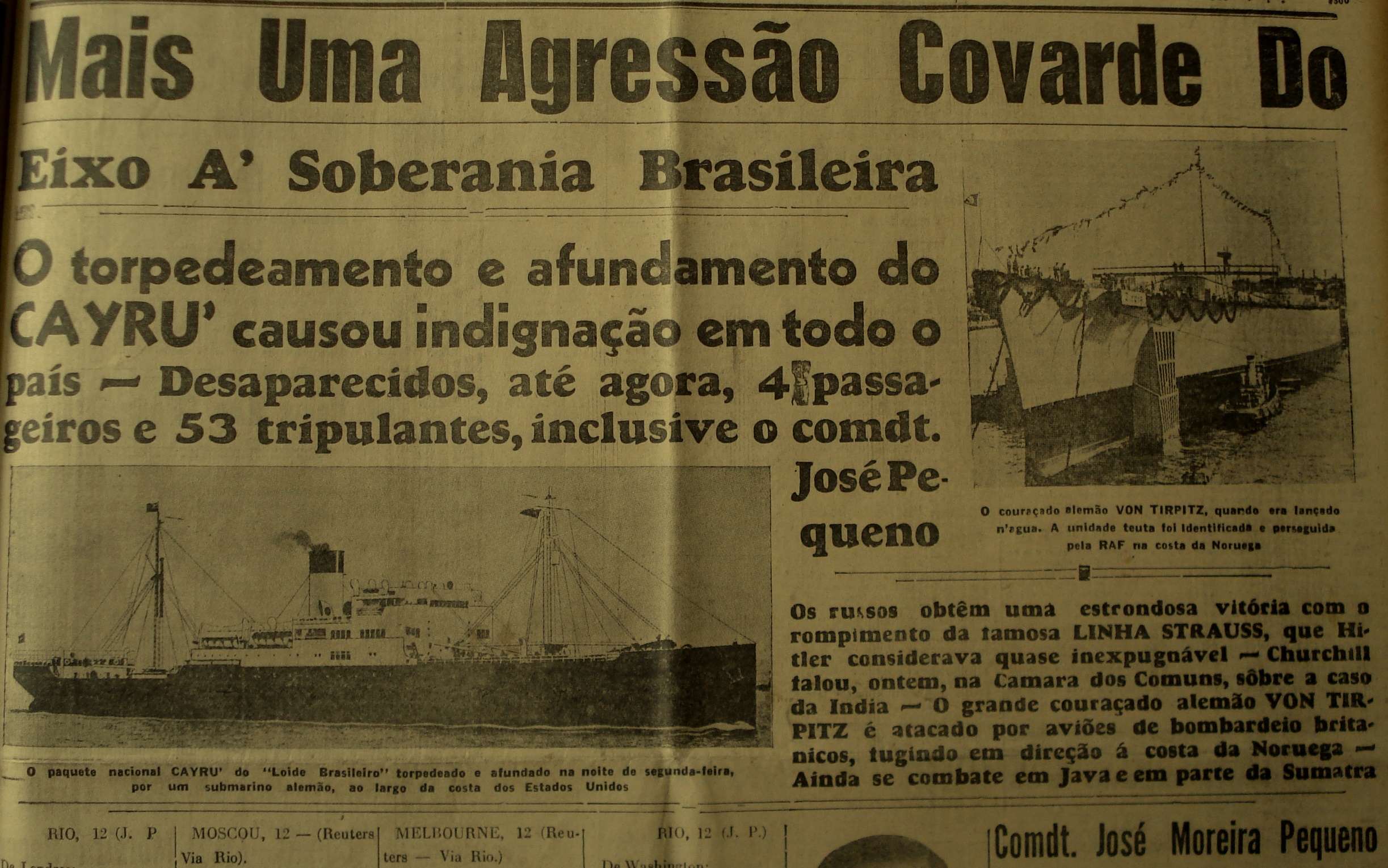 Natal newspaper announcing the sinking of a Brazilian boat in March 1942