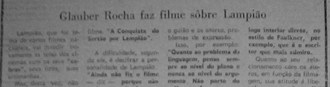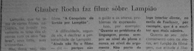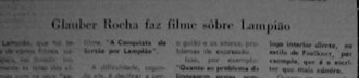 Na página 4, da edição de sexta feira, dia 24 de novembro de 1972, no extinto jornal “A República”, encontro a manchete que apresento na fotografia abaixo. Este material, uma reprodução da revista portuguesa “Vida Mundial”, iniciava afirmando que Lampião, “que já havia sido tema de vários filmes nacionais”, iria novamente invadir as telas com seus “cabras, seus tiros e suas artimanhas” e a direção seria de Glauber Rocha.