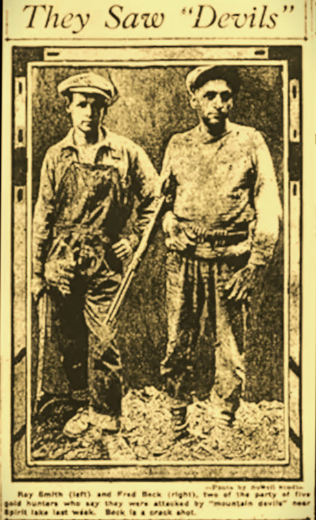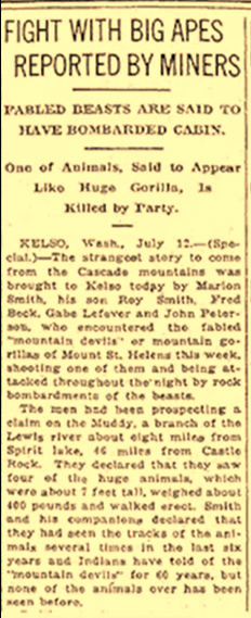 Na sequência eles alegaram que estavam a 13 quilômetros de Spirit Lake, quando encontraram quatro daqueles estranhos e gigantes animais se movendo pela floresta com passos eretos, semelhantes aos humanos. “Eles são cobertos por longos cabelos pretos”, relatara ao jornal The Oregonian, informando as descrições oferecidas pelos homens. “Suas orelhas têm cerca de dez centímetros de comprimento e ficam retas. Eles têm quatro dedos, curtos e atarracados.”