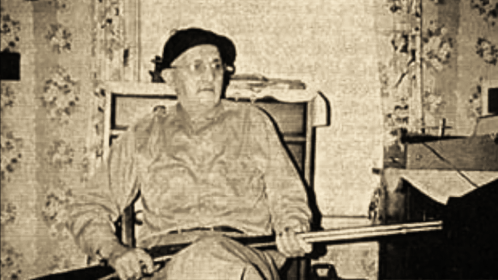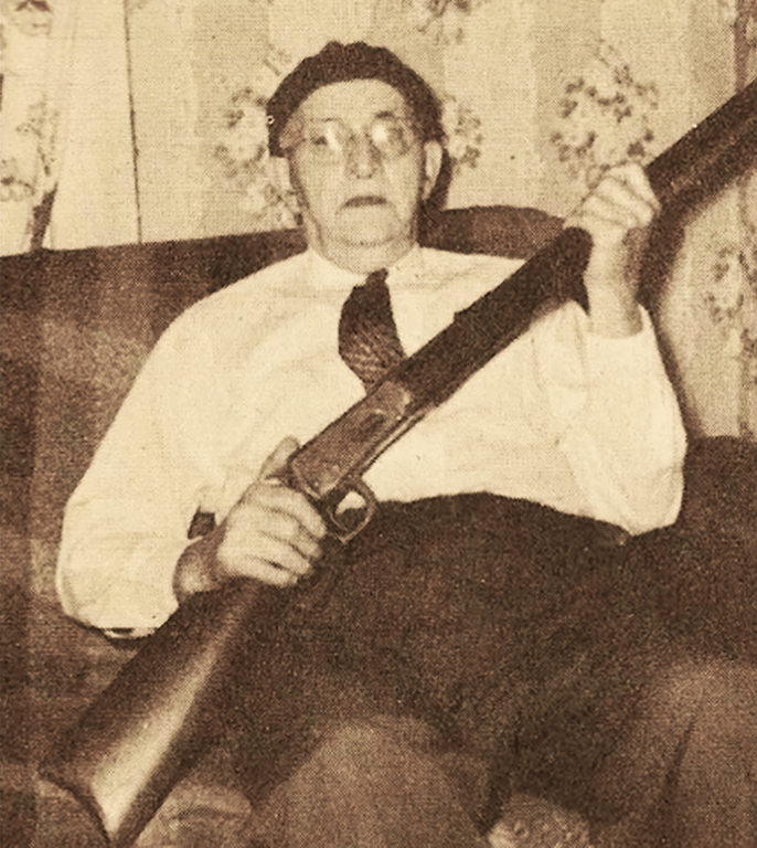Um idoso Fred Beck segura o mesmo rifle Winchester 30-30 utilizado no caso de 1924 durante uma entrevista.