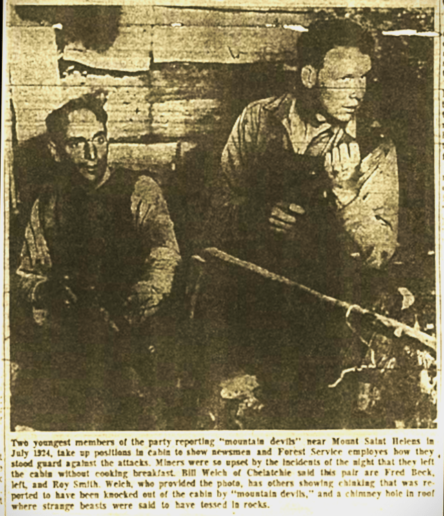De qualquer maneira os barulhos estranhos e as enormes pegadas chamaram a atenção daqueles rudes e esforçados mineradores. Logo eles souberam no comércio de Kelso e na vizinha comunidade de Longview, que estava acontecendo situações estranhas, ligadas a criaturas esquisitas na área do Monte Santa Helena. E não eram histórias muito antigas dos nativos americanos, mas vinda de mineiros e madeireiros que trabalhavam naquele setor. Falavam do avistamento de certos “Demônios da montanha”, ou coisas que pareciam com “Gorilas”, ou “Grandes macacos peludos”. Mas a verdade é que os cinco trabalhadores da mina de Vander White não deram muita importância a essas histórias. Talvez porque entre eles o que não faltavam eram rifles, espingardas, revólveres e muita munição.