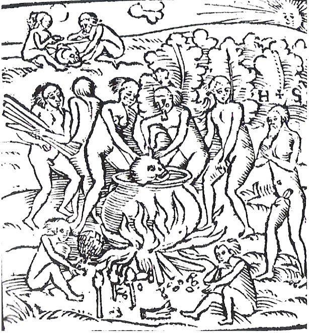 Visão européia sobre os indígenas brasileiros no século XVII. Ritual de canibalismo visto pelo alemão Hans Staden, o barbudo nu a direita na imagem. Vejam como ele se coloca horrorizado diante da cena – Fonte – Wikipedia.com.