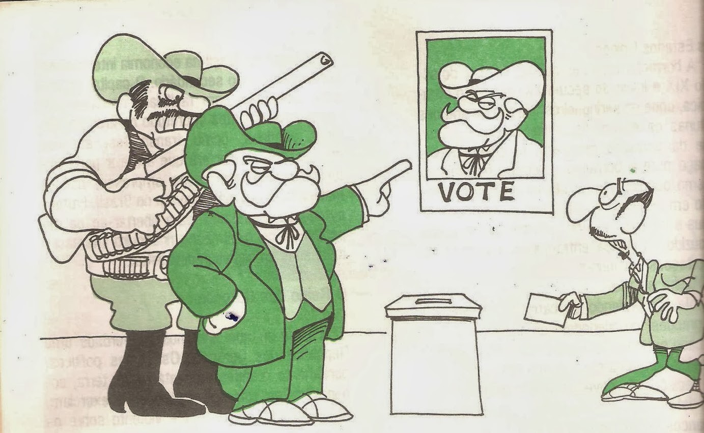 Certa feira, o escrivão eleitoral que também devia o cargo ao chefe político, conduziu a folha de votantes até a escola para que os alunos fizessem a aposição das assinaturas dos votantes que não sabiam assinar e que eram eleitores certos do chefe situacionista. Apurados os votos, o Sr. Juiz eleitoral determinou ao oficial de justiça (o escrivão encontrava-se em diligências) que o mesmo lesse em voz alta os nomes constantes na folha de votação.