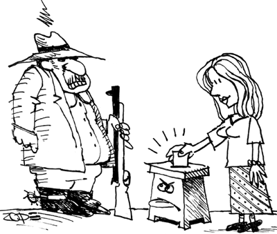Este último método de votação foi utilizado até 1957. Ao eleitor menos esclarecido resta a convocação para uma cruzada de combate aos políticos caras-de-pau, submetendo-os a uma derrapagem no óleo de peroba da consciência sob a poeira da obscuridade.