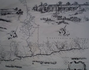 “Cena da Expedição do Tenente-Coronel Affonso Botelho”, aquarela do artista Joaquim José de Miranda (1771) que retrata o confronto entre indígenas e bandeirantes. Provavelmente cenas como essa ocorreram no Rio Grande do Norte – Fonte – https://www.historia.uff.br/impressoesrebeldes/revolta/guerras-barbaras/