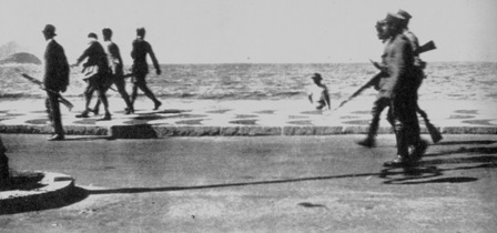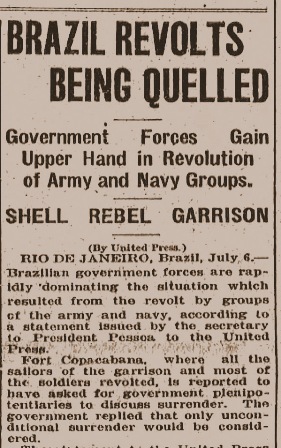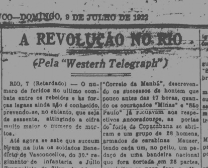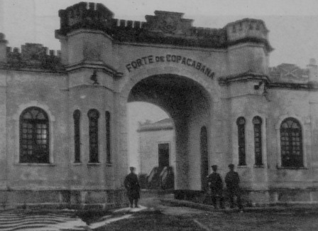 [24] A Revolta dos 18 do Forte de Copacabana foi uma revolta tenentista ocorrida na cidade do Rio de Janeiro em 5 de julho de 1922. Foi a primeira revolta tenentista da República Velha. Teve a participação de 17 militares e um civil. Suas causas principais estão no descontentamento dos tenentes com o monopólio político do poder no Brasil por parte das oligarquias (principalmente ricos fazendeiros) de Minas Gerais e São Paulo. Embora o movimento tivesse sido planejado em várias unidades militares, somente o Forte de Copacabana e a Escola Militar se levantaram no dia 5 de julho de 1922. O forte foi bombardeado e a rendição dos rebeldes foi exigida. O tenente Siqueira Campos e um grupo de militares rebeldes pegaram armas e marcharam pelas ruas em direção ao Palácio do Catete (sede do governo federal na época). Durante a marcha alguns militares desistiram, ficando apenas 17 que receberam o apoio na rua de um civil, totalizando 18. Os rebeldes foram cercados pela tropa do Governo Federal. Após forte tiroteio em frente ao posto 3 da praia de Copacabana, somente Siqueira Campos e Eduardo Gomes sobreviveram e foram presos. Os outros dezesseis integrantes do movimento foram mortos no combate.