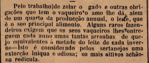 Mas os cronistas apontam que a maioria dos vaqueiros aceitavam estes acordos espúrios por estarem presos aos seus arraigados e seculares códigos de condutas diante dos patrões, ou por puro desconhecimento aritmético. Muitos baixavam a cabeça por precisarem do emprego. E a dispensa de um vaqueiro por um fazendeiro era algo tão importante que poderia se transformar até em notícia de jornal, conforme vemos acima.