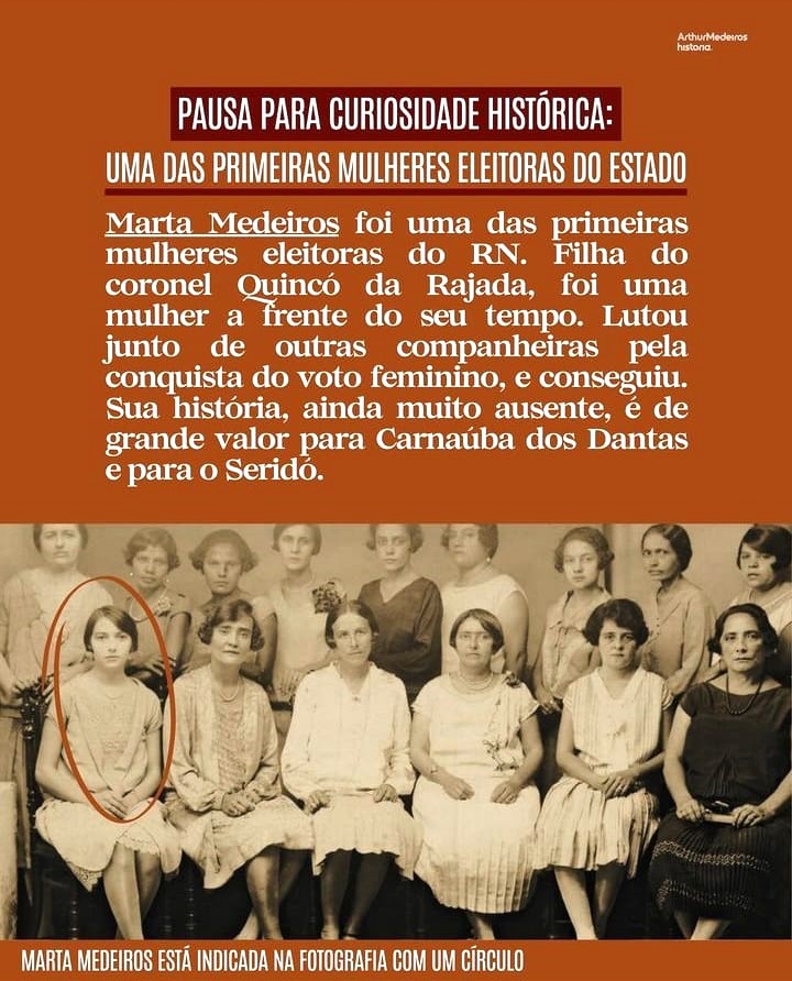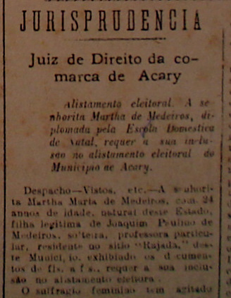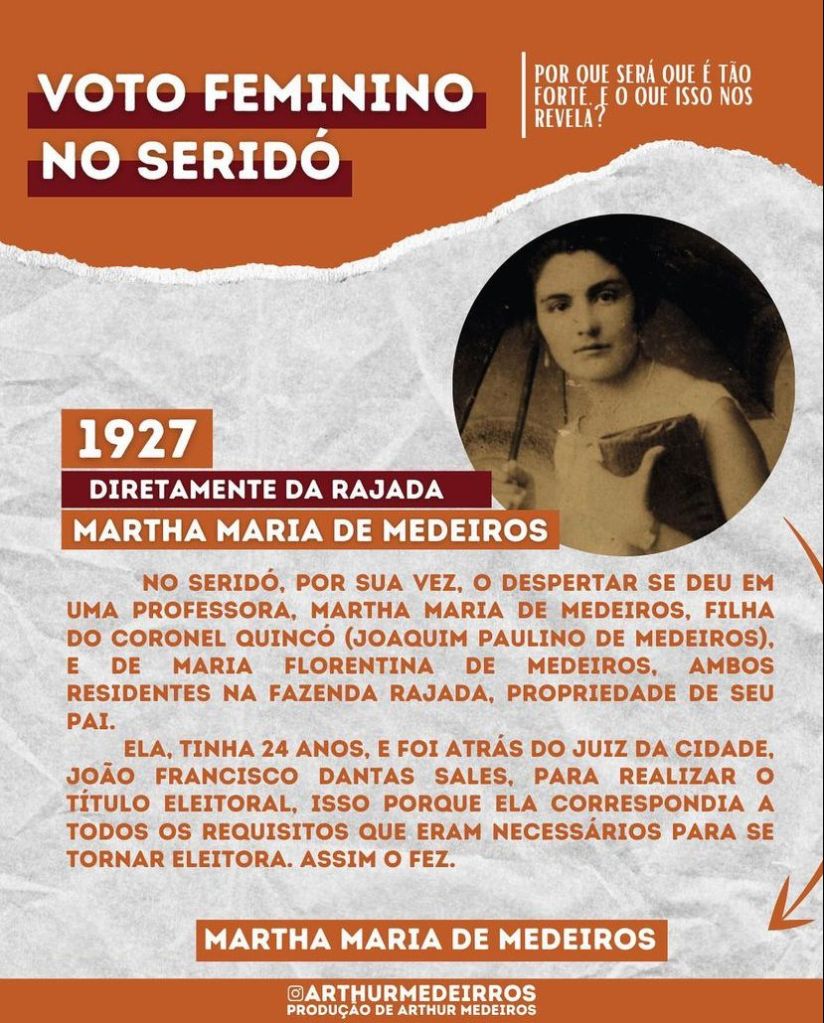 No Seridó Potiguar, mais precisamente em Acari, a professora Marta Maria de Medeiros, de 24 anos, nascida e morando na Fazenda Rajada, filha do fazendeiro e coronel nomeado da Guarda Nacional Joaquim Paulino de Medeiros e da senhora Maria Florentina de Medeiros (conhecida como Dona Maricota), buscava junto ao Juiz da cidade, João Francisco Dantas Sales, o seu alistamento eleitoral, pois preenchia todas as condições para a inscrição. O Dr. Sales era irmão do também juiz Celso Dantas Sales, pai dos Cadeais Dom Eugênio de Araújo Sales e Dom Heitor Sales. A decisão do juiz Sales, ante o pedido da professora, foi publicada oficialmente no dia 10 de dezembro de 1927, tornando-a a quarta eleitora do Rio Grande do Norte e a primeira da região do Seridó..