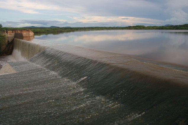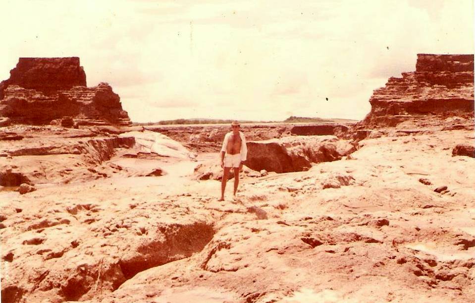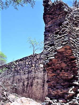 Seguimos a caminhada agora em aclive, devagar, em meio a um caminho de pedras soltas, que compõem o leito seco do rio que abastecia a antiga barragem. Ao meio-dia o calor era insuportável, mas a ideia de conhecer este estranho lugar animava o grupo. Durante esta parte do caminho, contemplamos muitos lajedos de pedras, que na época do inverno se transformam em corredeiras. Mais um declive para aliviar e depois mais um aclive para penalizar e o altímetro do GPS marcando uma altitude de 430 metros.