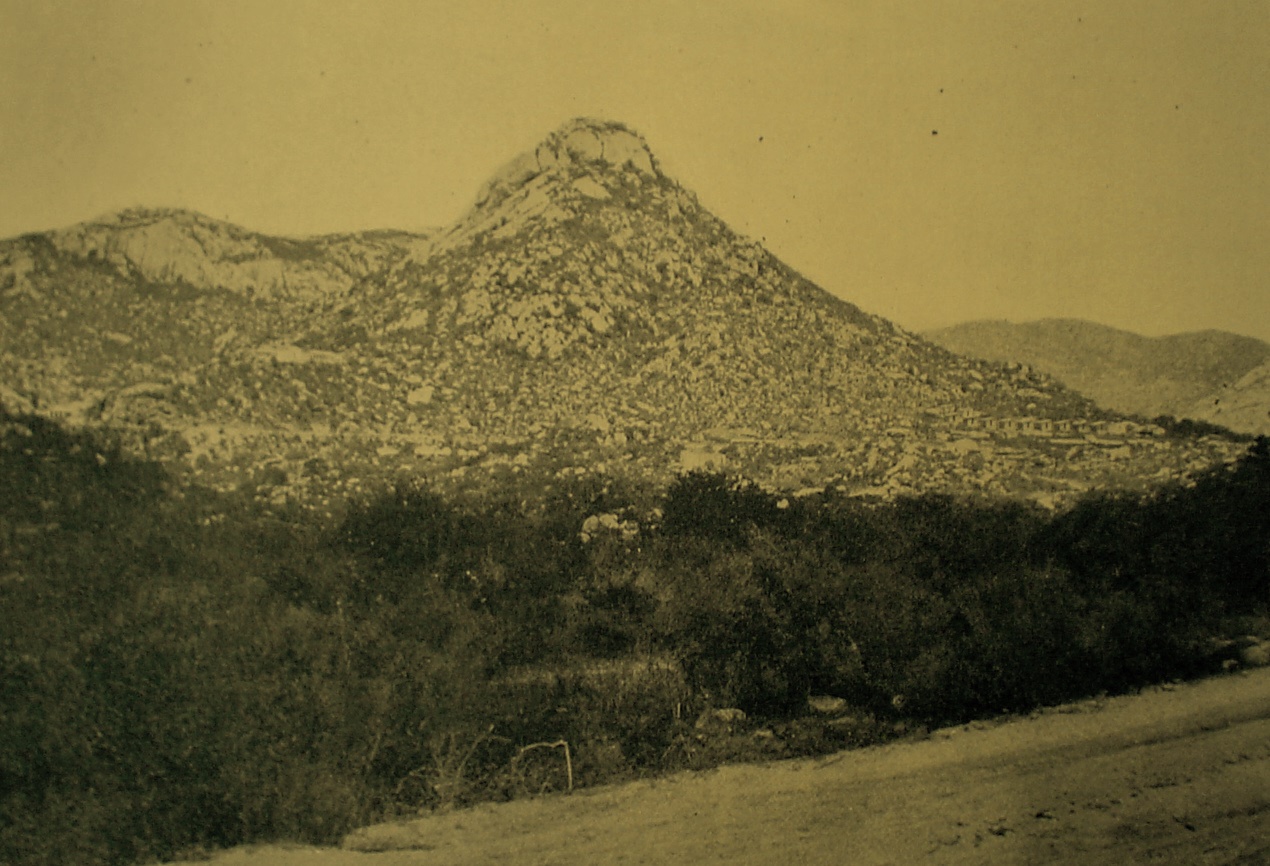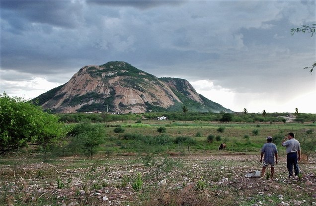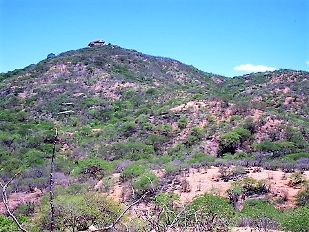 A pedra circular, no centro da foto e no alto da serra, é o bloco de granito onde está a Gruta dos Tapuias.