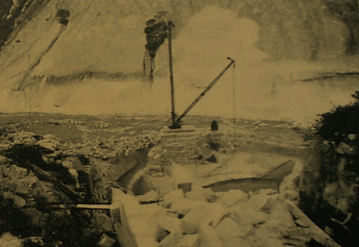 Em certo ponto da caminhada, nos deparamos com uma grande parede de pedra, com mais ou menos sete metros de altura, e quase dois metros de espessura. Gilson comentou que a estrutura fazia parte de uma antiga barragem privada, da qual não sabia o nome, construída em 1941 e destruída durante as enchentes de 1958. Exploramos o local e fiquei imaginando o trabalho que foi construir esta obra, utilizando braços humanos e tração animal.