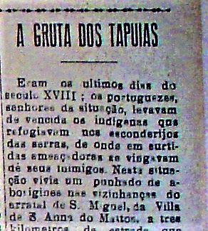 Na primeira página, da edição de 19 de abril de 1928, do antigo jornal potiguar “Diário de Natal”, encontra-se um artigo intitulado “A Gruta dos Tapuias”, onde um articulista que se intitulada apenas “Dapraia”, escrevia da cidade costeira de Touros no dia 7 de abril de 1928 e narrava a visita que havia realizado a uma gruta, na zona rural de Santana do Matos, que ele afirmava ter sido um dos últimos abrigos utilizados pelos indígenas que habitaram nosso sertão.