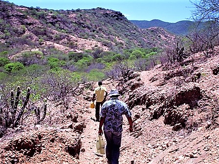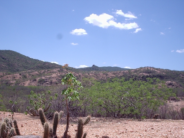 A trilha existente segue primeiramente em declive, depois vai beirando um riacho que estava completamente seco na ocasião. É uma região de caatinga fechada, onde se deve andar com cuidado e atenção. Muitos mandacarus, facheiros, com seus pontiagudos espinhos, estão às margens da picada.