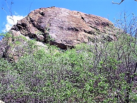 Finalmente o grupo chegou ao grande bloco de granito que compõem a Gruta dos Tapuias, sendo esta rocha uma estrutura que possui em torno de 20 metros de altura e uns 3.500 m² de área. Como descreve “Dapraia”, duas fendas servem de entrada, onde uma pequena escalada coloca a pessoa dentro de uma parte da gruta.