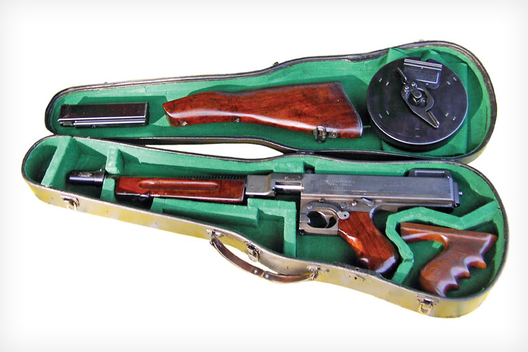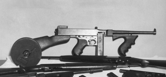[3] A submetralhadora Thompson (frequentemente chamada de “Tommy Gun”) era uma arma norte-americana icônica, desenvolvida por John Taliaferro Thompson, principalmente no calibre 45 ACP (Automatic Colt Pistol). Ela ganhou destaque durante as década de 1920 e 30 como “armas de gângsteres” e foi amplamente utilizada pelos Aliados na Segunda Guerra Mundial, sendo os modelos de 1928 e M1A1 os mais conhecidos. Fabricada nos Estados Unidos principalmente pela Auto-Ordnance Corporation, era renomada por sua confiabilidade, mas também por seu peso e tamanho.