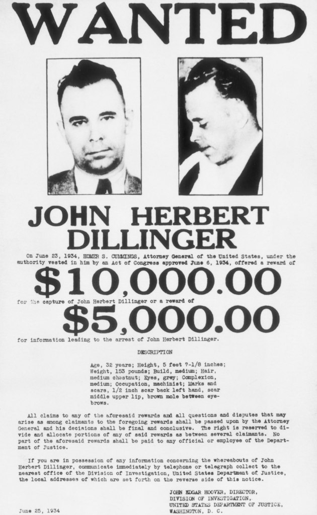 No dia do seu 31º aniversário, 22 de junho de 1934, Dillinger foi declarado o primeiro Inimigo Público Número Um dos Estados Unidos, o primeiro a ter essa distinção. No dia seguinte, o governo federal prometeu uma recompensa de 10.000 dólares pela sua captura e uma recompensa de 5.000 dólares por informações que levassem à sua prisão.